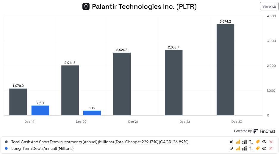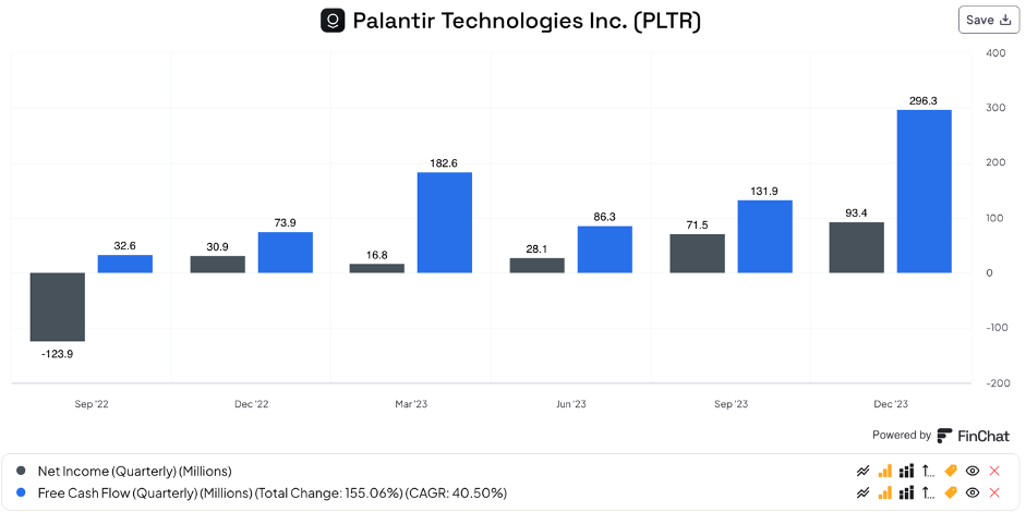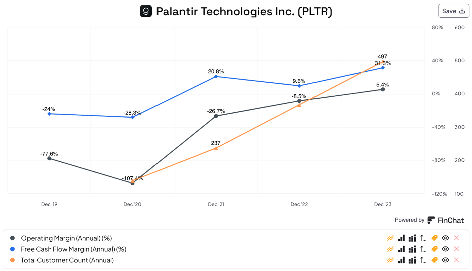 When comparing the last couple of years, Palantir is showing great operating leverage: net profit margins improved from -78.1% in 2021 to 9.4% in 2023, with free cash flow margins improving from -24% to 31.3% over the same period:
