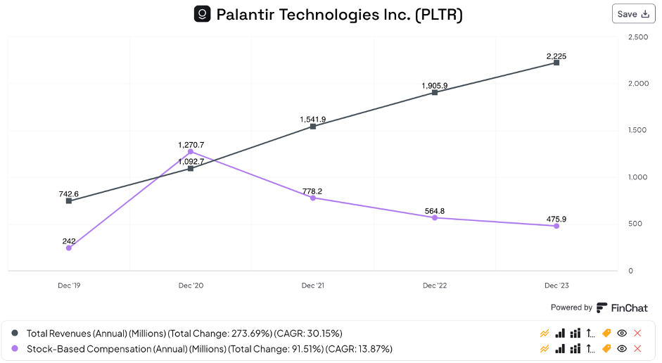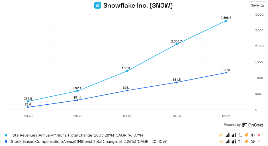 But while PLTRs revenues went up, its stock-based compensation has been steadily declining. Snowflake has seen its revenues skyrocket but so has its SBC. While it did decelerate from previous levels, it is still up 35.6% in 2023 YoY.