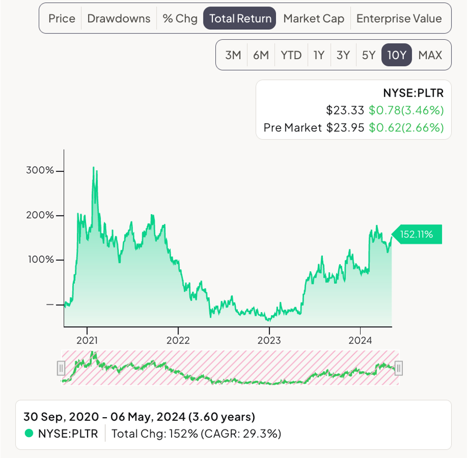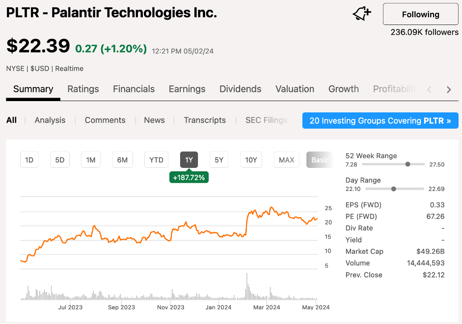 Palantir is trading at $22.39 as of May 2, 2024, up 187% over the past 12 months and trading near its 52-week high of $27.50, as is often the case with quality companies. While you might think that what goes up must come down, that often isn’t true. Mostly, winners keep on winning. Just like in life. Think of sportsmen, musicians, writers, actors. When they are the A-players in their field, they often remain being so for many years.