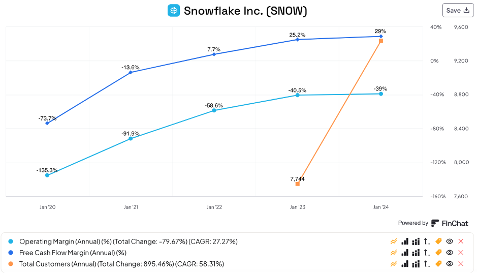 I think you can see the clear trend: while Snowflake is growing its customer count aggressively, its margins are flattening while SBC is going up. While Palantir is also growing its customer count, it shows improving margins with SBC coming down significantly.
