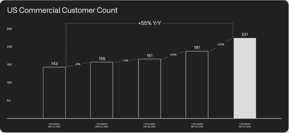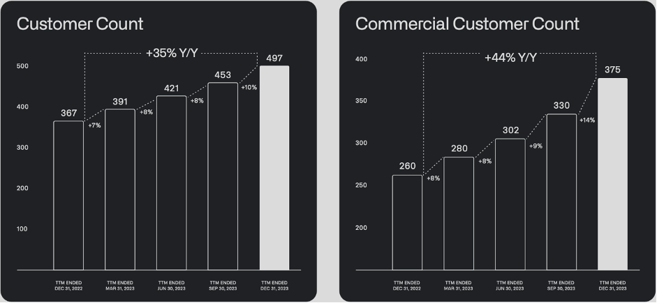 To me, these are important metrics to keep monitoring going forward. I expect them to expand further in the coming quarters and years. Commercial revenue growth grew 32% YoY in Q4 2023 while government revenue grew by 11% YoY. For government contracts, the picture is more mixed and that’s because government is lumpy as it takes time to get bills passed and deals don’t come quarter by quarter but rather all at once.