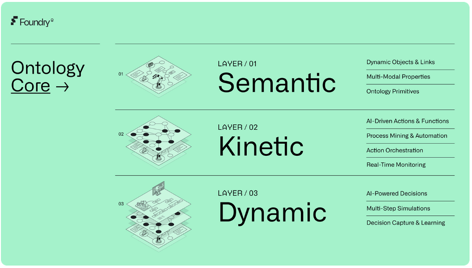The ontology consists of three layers. Firstly, there are the semantics. These are the real-world elements of the business. Conceptual and object-oriented in nature. What does the business consist of? A warehouse, trucks, et cetera. Then there’s kinetics, which allows a business to define its behaviors, actions, and decisions. Through kinetics, automations, processes, and models can be put together and coordinated to run the business. Finally, the dynamics allow the user to run simulations across the organization to see the potential impact of the decisions that are being taken and to then take action based on that information.