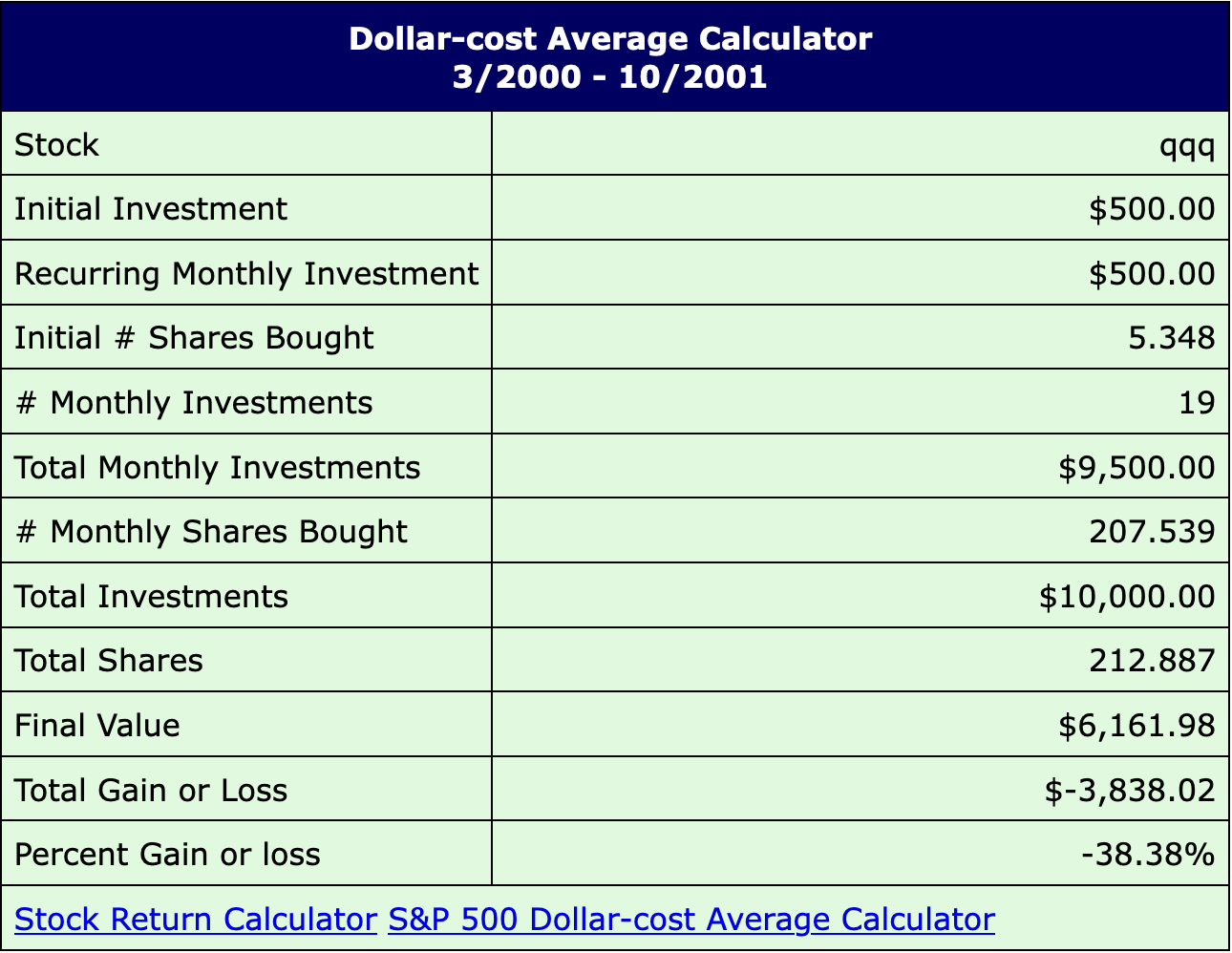 If you had not invested that $10,000 all at once in March 2000 but used it as a starting point with an initial $500 investment followed up with 20 monthly $500 additions to the Invesco QQQ Trust Series 1 (the Nasdaq tracker) you would have ended up with a final value of $6,161 or a -38.38% loss. Still painful, but much easier to turn back into green.