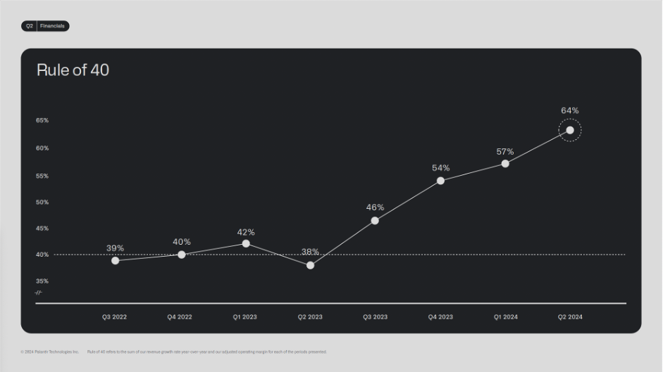 Palantir managed to pass the Rule of 40 bar comfortably again this quarter with a score of 64%. I think you can clearly see the trend here:
