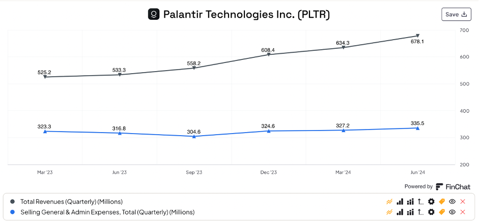 This also shows in the increasing operating margin over time: while only 0.8% in Q1 2023, Palantir reported an operating margin of 15.5% in the current quarter.
